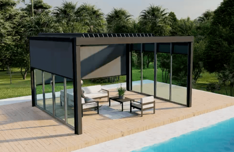 Биоклиматические системы затенения — алюминиевые конструкции с регулируемыми ламелями для автоматического контроля освещённости и вентиляции наружных и внутренних пространств. Используются для обустройства террас, веранд, фасадов коммерческих и жилых зданий.