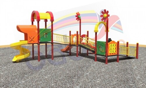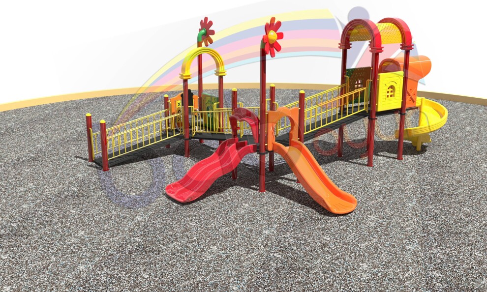 В состав комплекса входят игровая башня с крышей, две горки разной длины, лестница, мостик и защитные ограждения. Яркая цветовая палитра с преобладанием жёлтых, красных и оранжевых элементов делает комплекс визуально привлекательным и стимулирует интерес детей к активной игре.