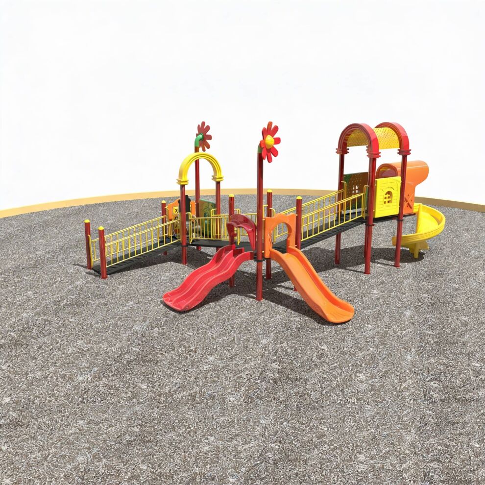 Модульный игровой комплекс ENB‑03 относится к безбарьерной серии Engelsiz и предназначен для установки на открытых детских площадках. Конструкция разработана с учётом требований безопасности и инклюзивности, обеспечивая доступность и комфорт для детей разных возрастов и физических возможностей. В состав комплекса входят игровая башня с крышей, две горки разной длины, лестница, мостик и защитные ограждения.
