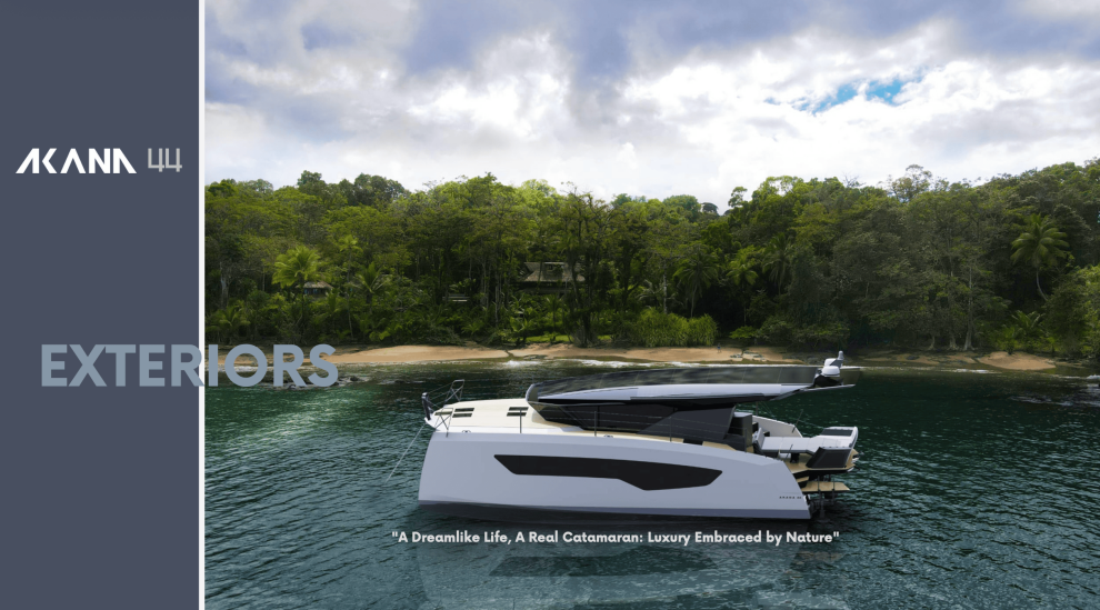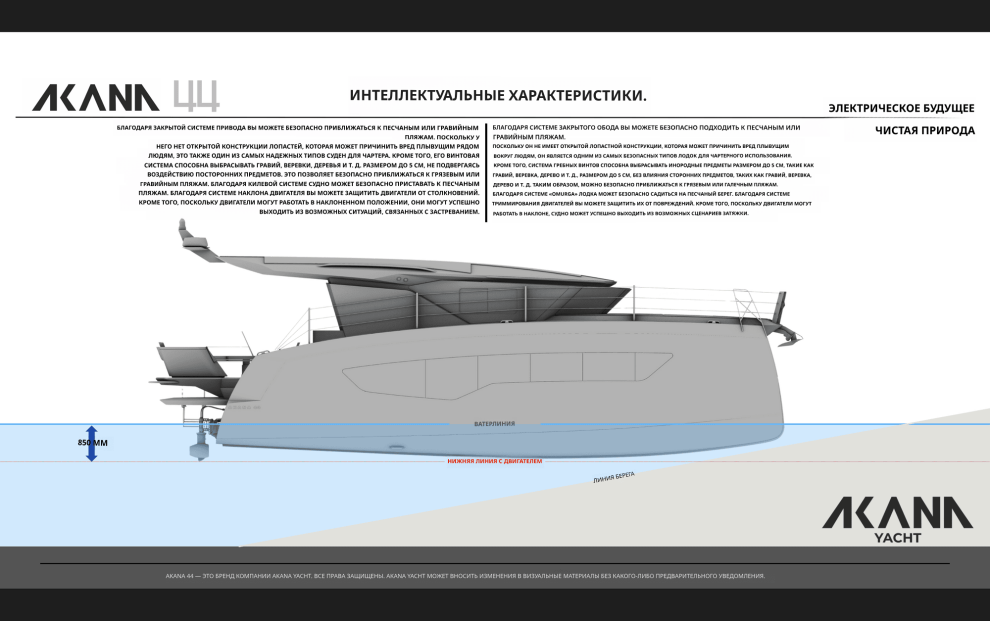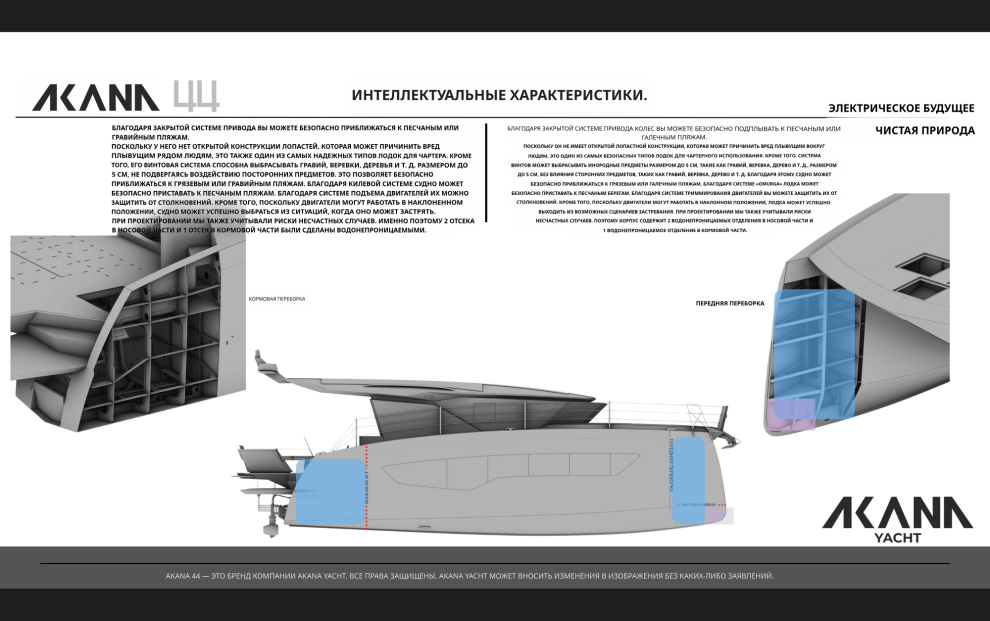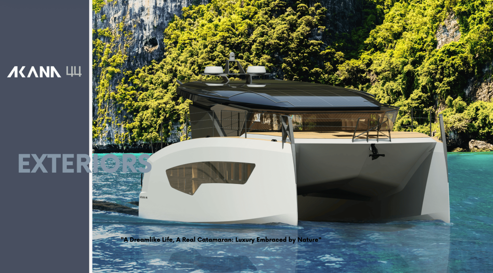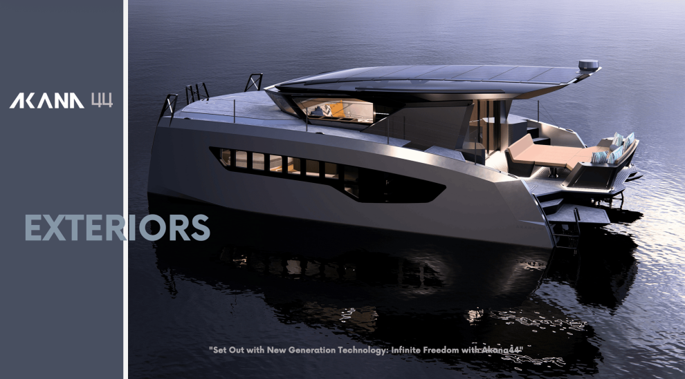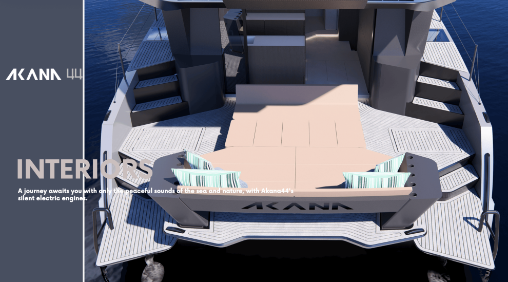 Akana 44 — двухкорпусный электрический катамаран длиной 13,35 м из алюминиевого сплава серии 5083. Производитель — Akana Yacht (Турция). Тяговые установки — два подвесных электродвигателя DEWJET Rim Drive мощностью 45 кВт и тягой 4 700 Н·м каждый. Категория CE: класс B. Доступен в версии владельца (3 каюты) и чартерной версии (4 каюты).