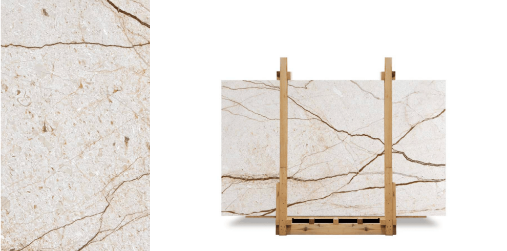 Камень имеет светлый кремовый фон, на котором проходящие прожилки варьируются от карамельных до тёмно‑шоколадных тонов. Контрастная текстура формирует динамичный рисунок, при этом общий вид остаётся гармоничным и естественным. Материал эффектно смотрится в исполнении букматч, образуя симметричные узоры, напоминающие абстрактные природные композиции.