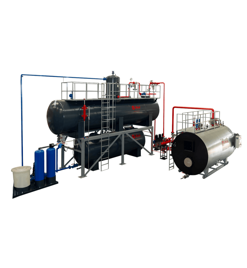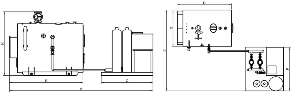 PBS200 Package Scotch Steam Boiler — полностью собранный промышленный трёхходовой паровой модуль для жидкого и газового топлива, оснащённый ПЛК-контроллером, системами водоподготовки, конденсатным баком и питательным насосом. Производительность — 200 кг/ч, габариты — 390×127×200 см.